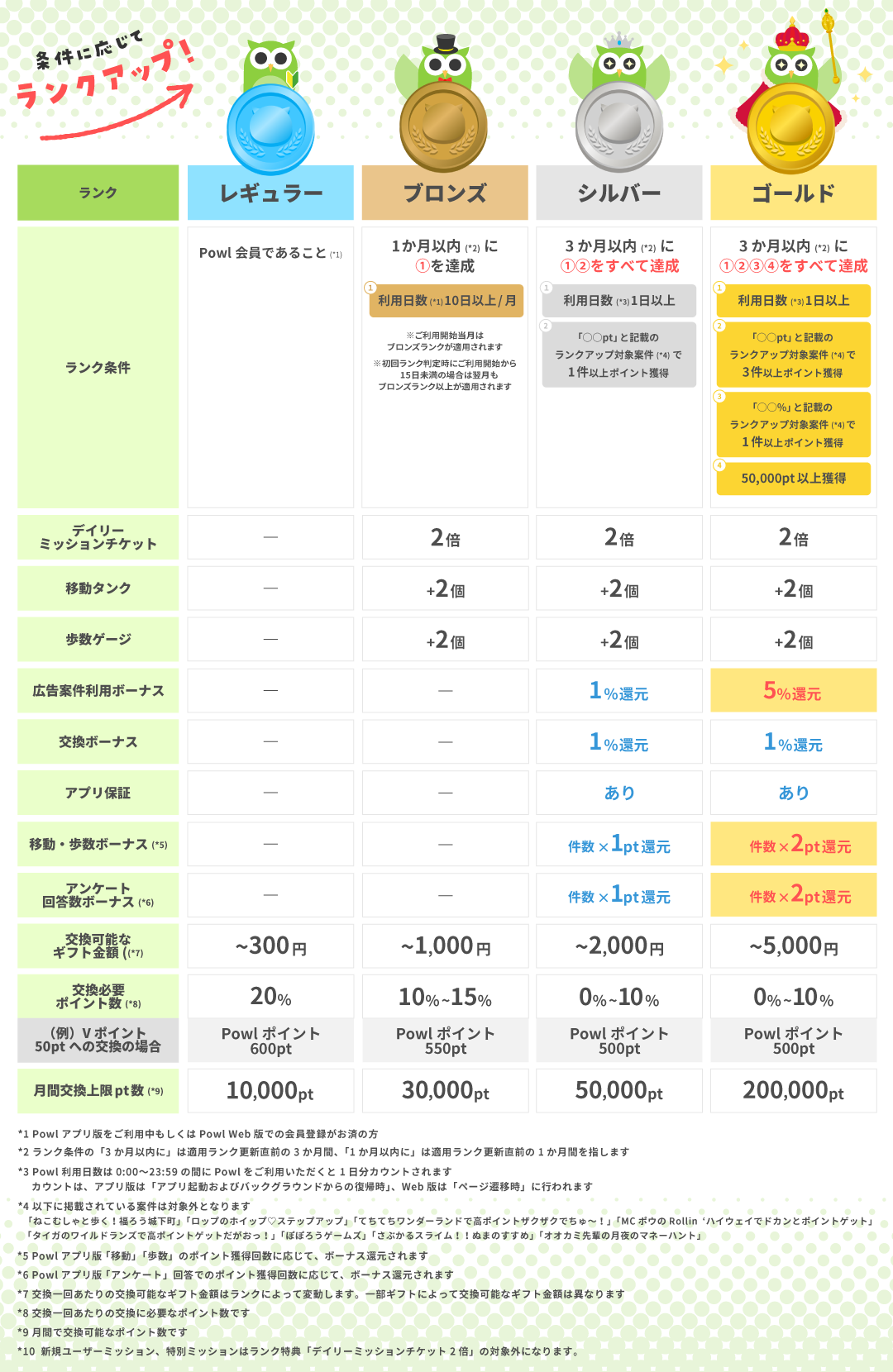 Powlでは会員ランク制度をスタートしました!ユーザー様のご利用状況に応じてレギュラー・ブロンズ・シルバー・ゴールドいずれかのランクが適用されます。会員ランク制度では、ランク条件を満たしたランクが適用され、ランクは毎月変動します。 ランクアップに応じて特典が利用できます。